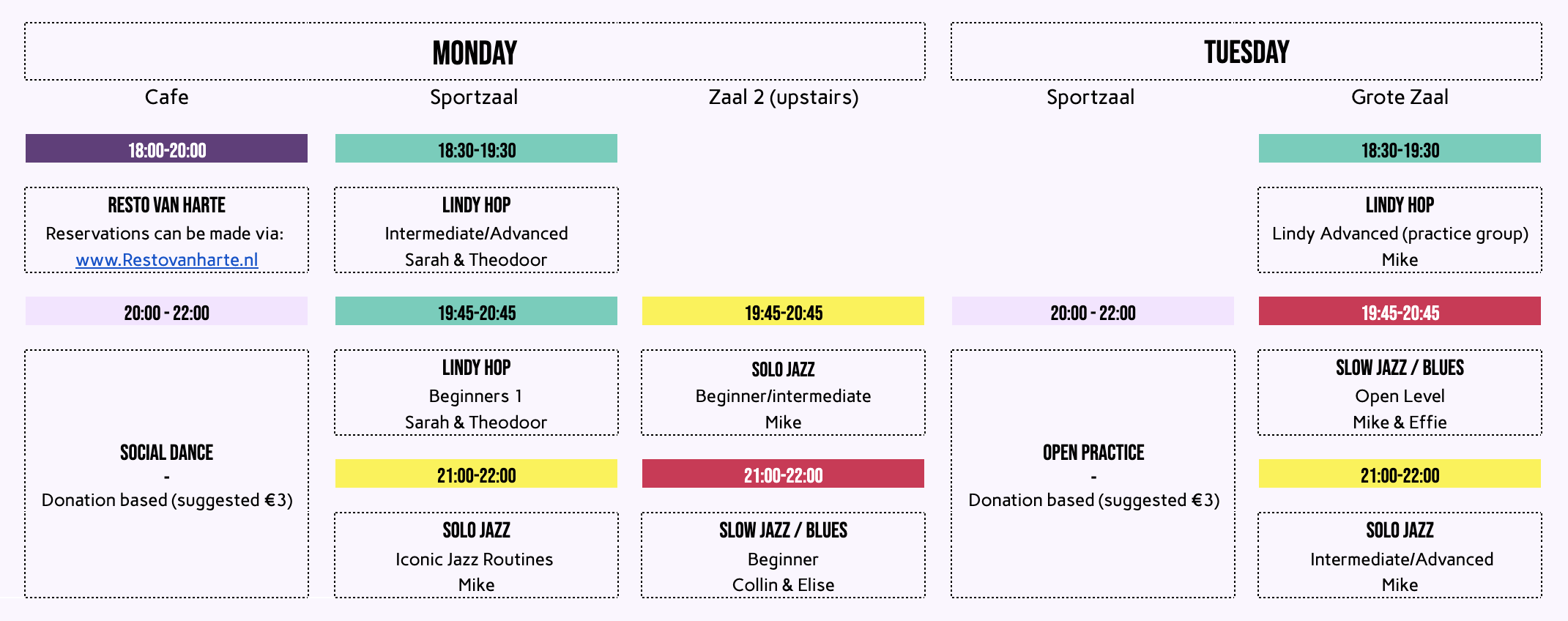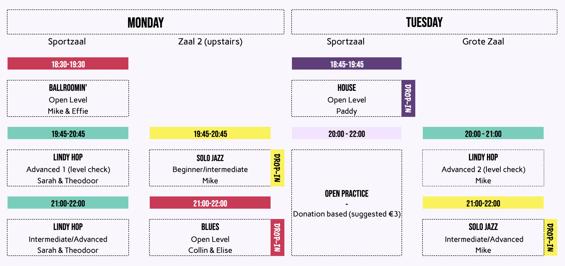 You can also join some of our Solo, Blues or Lindy hop classes as a drop-in. Check the schedule if this is possible. Payment for a drop-in class can be done on site (by cash or QR-code).